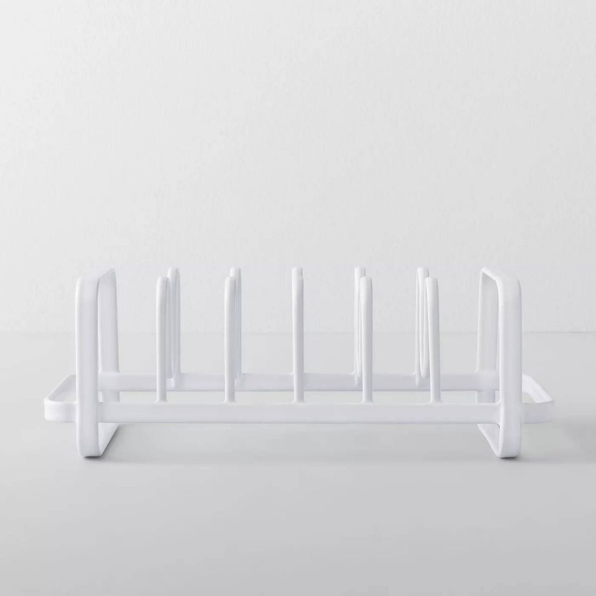 Free up extra space on your countertop or in your cupboards with the help of this handy Wire Storage Lid Organizer. Made from steel with a white finish for a crisp, clean look that coordinates with most kitchens, this metal lid organizer features multiple slots for holding the lids of your pots and pans in place so you can stack the cooking vessels for more compact storage. The 13.5-inch length easily accommodates multiple lids, while keeping them separated with built-in dividers for easy access when you need them.